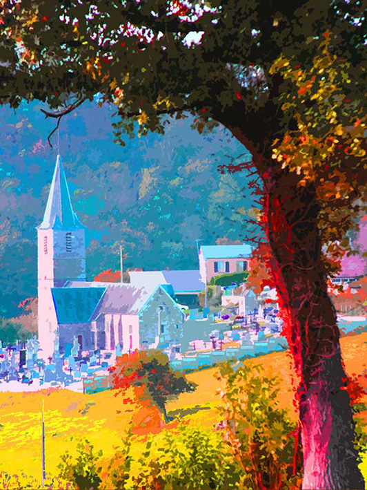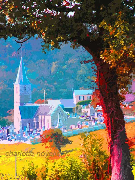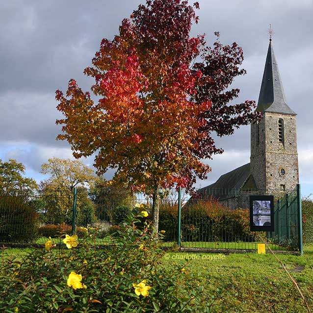Notre exposition itinérante Photopoèmes voyage chaque semaine dans toute la région. Mais il n'est pas toujours nécessaire d'aller très loin pour trouver un lieu adapté à nos installations éphémères : celui-ci se situe à moins de deux kilomètres de la Galerie Art & Déco du Bény-Bocage. La vue automnale du clocher de la belle église de Carville forme un environnement parfait pour accueillir "Ment" , émouvant poème de Marie-Jeanne Jaunâtre, en réédition cette année à notre atelier d'écriture.
