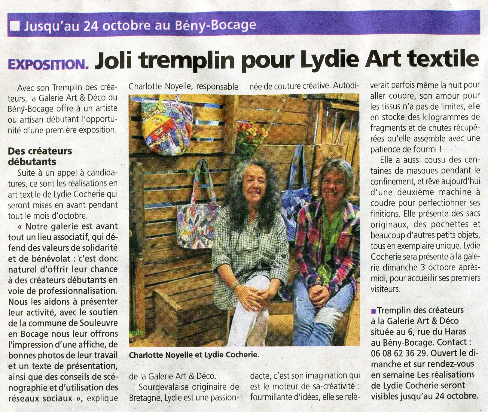 Et encore une fois merci à la presse locale... L'exposition de Lydie est installée à la Galerie Art & Déco, et vous pourrez dialoguer avec elle dimanche après-midi à partir de 14h.