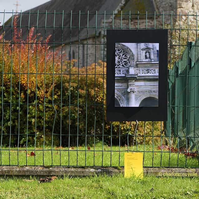 Notre exposition itinérante Photopoèmes voyage chaque semaine dans toute la région. Mais il n'est pas toujours nécessaire d'aller très loin pour trouver un lieu adapté à nos installations éphémères : celui-ci se situe à moins de deux kilomètres de la Galerie Art & Déco du Bény-Bocage. La vue automnale du clocher de la belle église de Carville forme un environnement parfait pour accueillir "Ment" , émouvant poème de Marie-Jeanne Jaunâtre, en réédition cette année à notre atelier d'écriture.